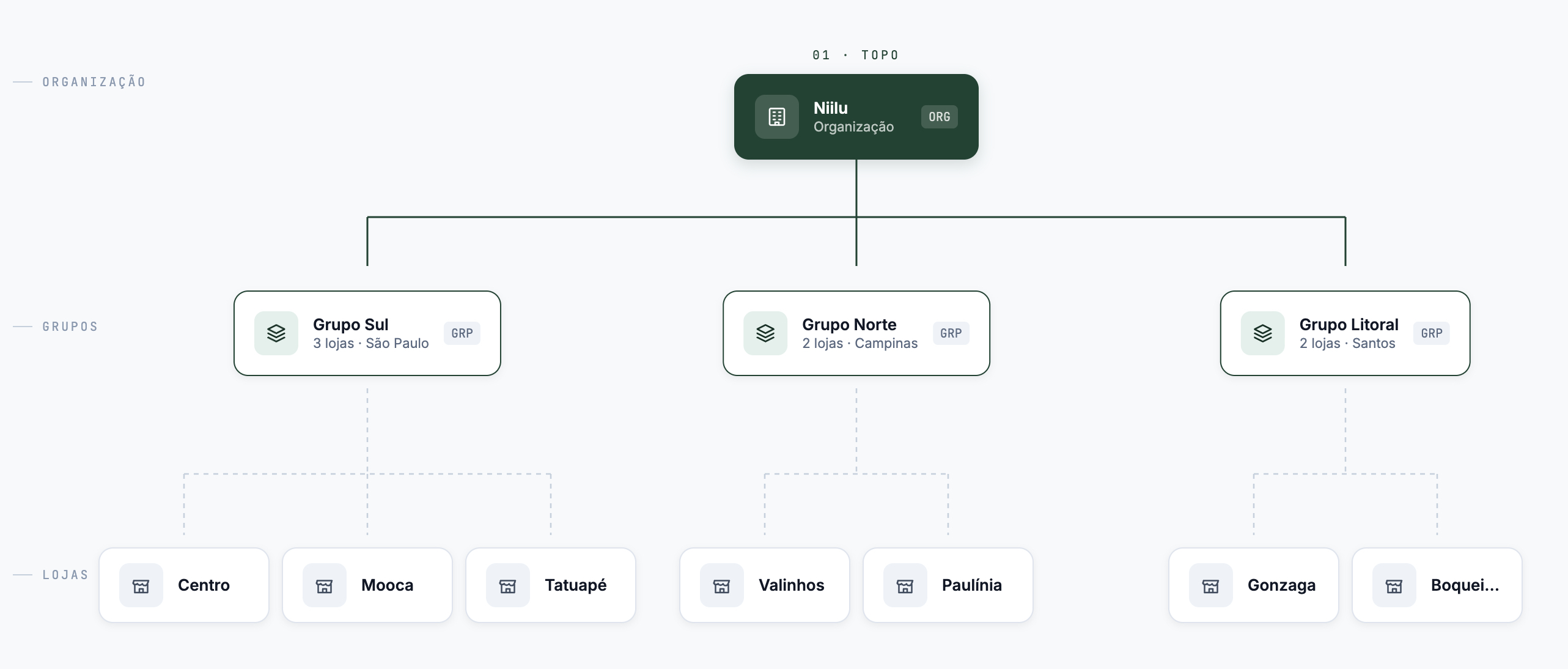 Pensei em alguns exemplos reais que mostram como a estrutura em organização, grupos e lojas transforma a operação diária: